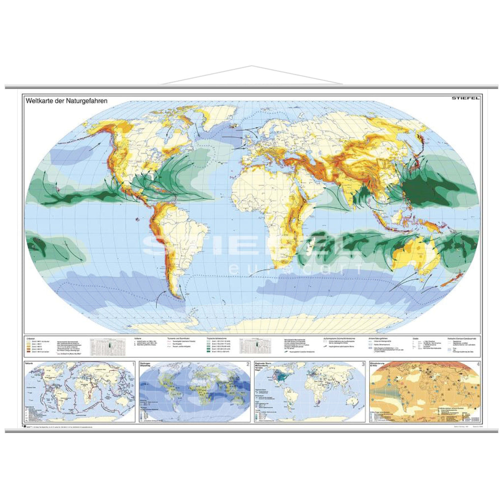 - Zusätzlich enthält die Karte vier weitere Weltkarten als Beikarten, welche die Themen Tektonik, Starkregen, Blitzschlag, Stürme und Klimaänderung veranschaulichen